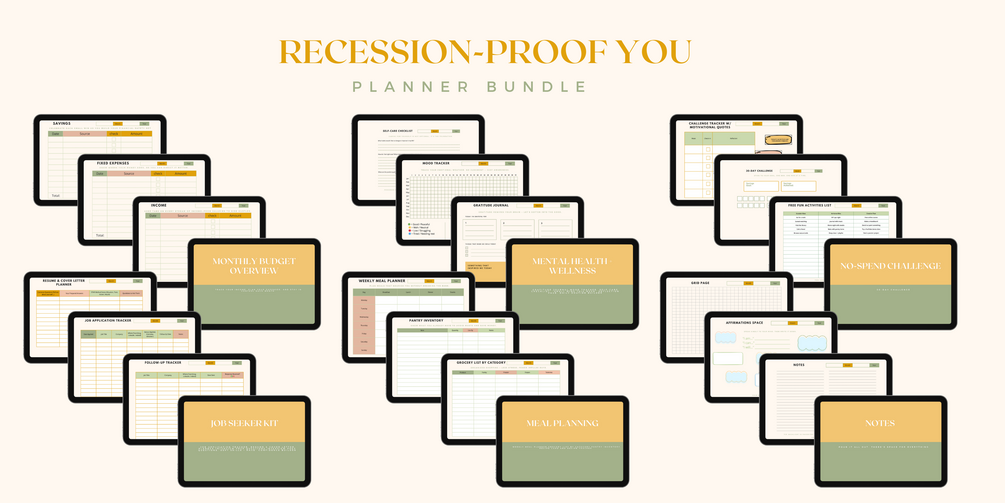 What’s Included: Budget Planner, Meal Planning Tools, Side Hustle Hub, Job Seeker Toolkit , Mental Health & Wellness Pages , No-Spend Challenge 30-day challenge,Notes & Brain Dump Section